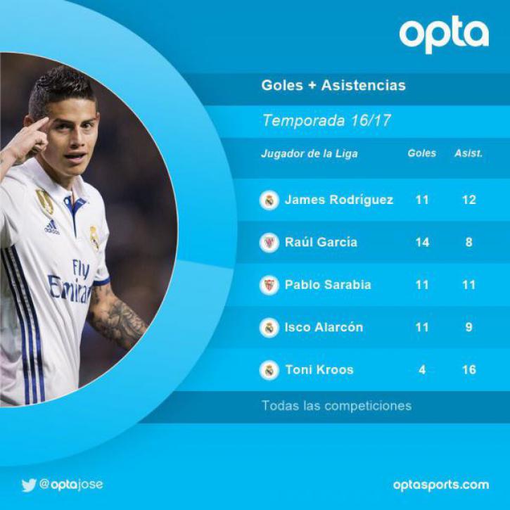 Отыграв за весь минувший сезон всего 2022 минуты, Хамес, тем не менее, смог стать самым полезным полузащитником по системе гол+пас среди представителей испанских клубов :