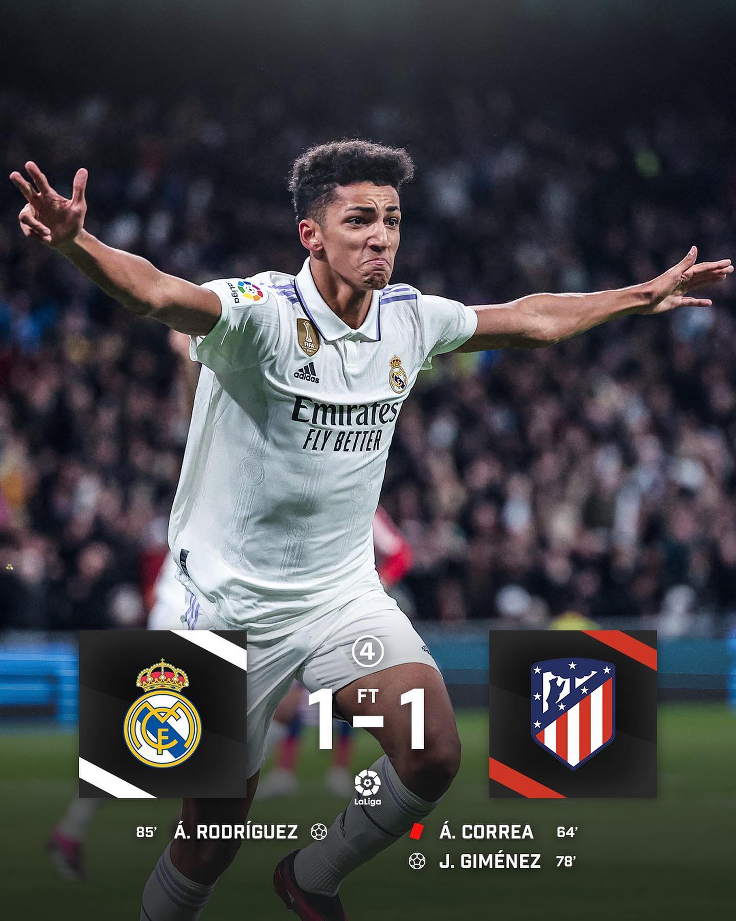 При этом, «Матрасники» сумели выйти вперёд на 78-й минуте после того, как Гризманн точно подал на голову защитнику Хосе Хименесу. Но команда Диего Симеоне не смогла удержать победный счёт. На 85-й минуте 18-летний Альваро Родригес, вышедший на замену, забил дебютный мяч за первую команду «Лос-Бланкос», замкнув навес Модрича с углового.