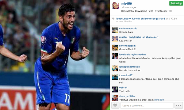 «Браво, Италия! Брависсимо, Пелле! Продолжайте в том же духе», – написал Балотелли в Instagram.