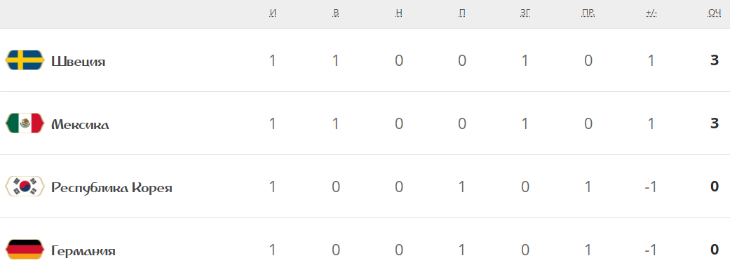 Главная сенсация первого тура группового этапа случилась в квартете «F». Сборная Германии неожиданно капитулировала перед Мексикой. С идентичным счетом Швеция обыграла Южную Корею.