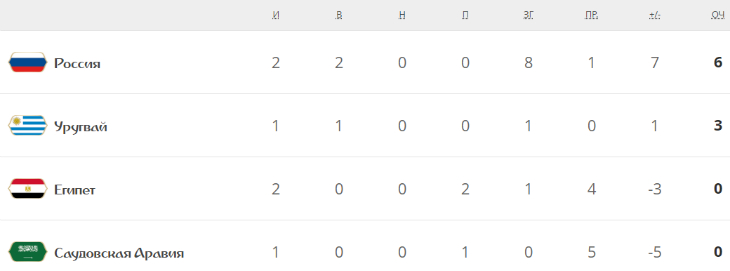 Матч-открытие ЧМ-2018 подарил первую сенсацию. Все понимали, что Россия сильнее Саудовской Аравии, но что подопечным Станислава Черчесова будет так легко, не мог подумать никто. В другом матче этого квартета Египет без своего лидера Мохамеда Салаха на последних минутах уступил Уругваю. К слову, Россия уже успела провести матч 2-го тура против Египта – победила и гарантировала себе выход в 1/8 финала.