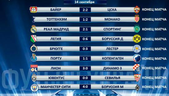 Второй день 1-го тура группового этапа Лиги чемпионов порадовал большим количеством матчей, забитых мячей и зрелищных поединков. В центральном матче игрового дня «Ювентус» и «Севилья» расписали безголевую ничью, это единственный матч, где не было забитых мячей. Московский ЦСКА сумел вырвать ничью у немецкого «Байера». Никаких проблем со своими соперниками не имели чемпион Англии и вице-чемпион Германии, «Лестер» 3-0 обыграл «Брюгге», а «Боруссия» на выезде разгромила «Легию» 6-0. Так же легко победа далась «Манчестер Сити» и «Лиону», а вот «Порту» и «Копенгаген» сильнейшего так и не определили. «Монако» в непростом матче обыграл «Тоттенхэм». А вот наиболее драматический поединок проходил в Мадриде. Столичный «Реал», проигрывая по ходу встречи «Спортингу», на последних минутах сумел вырвать победу.