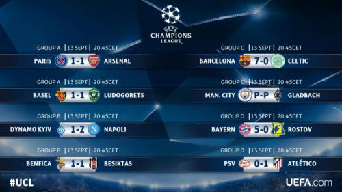 Первый день группового этапа Лиги чемпионов сезона 2016/17 стал удивительно результативным и во многом неожиданным. В центральном матче игрового дня «ПСЖ» и «Арсенал» не сумели выявить сильнейшего. Неудачно дебютировал в ЛЧ «Ростов». Пожалуй, все прогнозировали, что «Бавария» в родных стенах обыгрывает российскую команду, однако мало кто мог подумать, что это произойдет так легко и непринужденно. Киевское «Динамо» в непростом домашнем матче против «Наполи» не сумело зацепиться даже за ничью. Каталонская «Барселона» уже в первом туре заявила о своих амбициях на сезон, растоптав чемпиона Шотландии «Селтик». «Бенфика» на последних минутах упустила победу над «Бешикташем», а «Базель» едва спас 1 очко в матче против «Лудогорца». Минимальную победу одержал мадридский «Атлетико», на выезде переиграв «ПСВ». А вот из-за сильных дождей, прошедших в Манчестере за несколько часов до начала матча, поединок «Манчестер Сити» - «Боруссия М» перенесли на неопределенный срок.