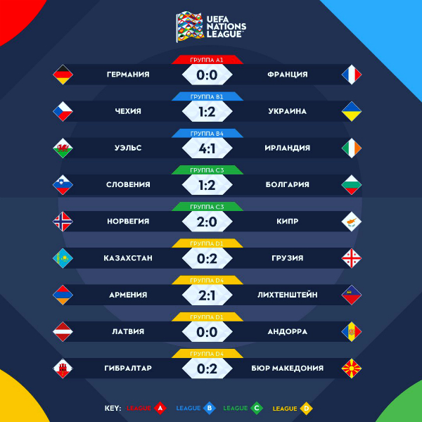 В центральном поединке дня чемпионы и экс-чемпионы мира, французы и немцы, покинули поле без забитых мячей. В дивизионе «В» сборная Украины одержала волевую победу над Чехией, в другом матче Уэльс Гарета Бэйла разгромил Ирландию. Ну, а историческое событие произошло в дивизионе «D», где в матче-открытии Лиги Наций сборная Грузии на выезде одолела Казахстан.