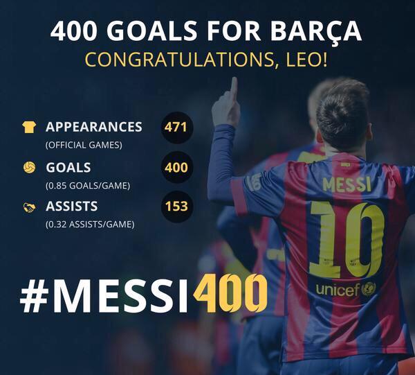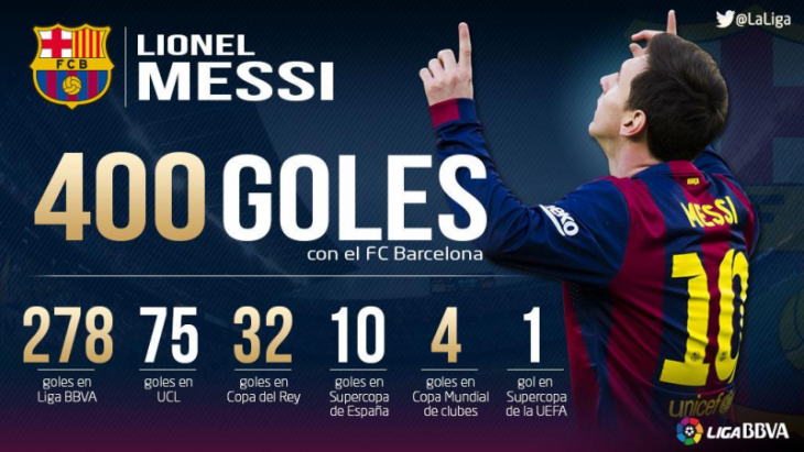 400 голов Месси распределились так: 278 мячей в Примере, 75 – в Лиге чемпионов, 32 – в матчах Кубка Испании, 10 – в Суперкубке Испании, еще четыре гола Лео забил на клубном чемпионате мира и один – в Суперкубке УЕФА.