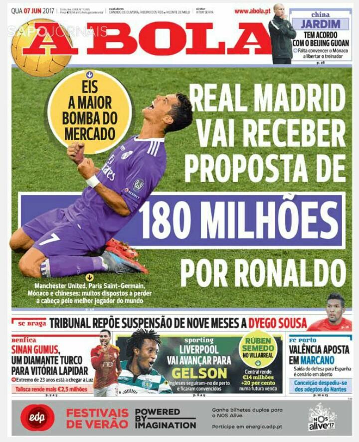 Как сообщает A Bola, бывший клуб игрока «Манчестер Юнайтед», а также «ПСЖ», «Монако» и один китайский клуб готовы предложить за 32-летнего игрока 180 миллионов евро.