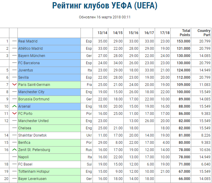 Завершились противостояния 1/8 финала Лиги чемпионов и Лиги Европы, определились четвертьфиналисты еврокубков, соответственно официальный сайт УЕФА опубликовал рейтинговые списки клубов, по состоянию на 16 марта.