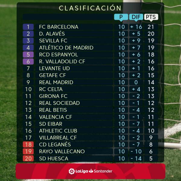 На Пиренеях завершился 10-й тур чемпионата Испании по футболу. Этот уик-энд оказался одним из самых интересных в новом сезоне, в первую очередь потому, что зрители увидели дебютное в сезоне Эль-классико, в котором «Барселона» не оставила никаких шансов «Реалу» и оставила «королевский клуб» без главного тренера. Интрига в Ла Лиге закручивается, «Алавес» обыграл «Вильярреал» и является главным преследователем «Барселоны». Неожиданно в зоне еврокубков идет дебютант «Вальядолид», а «Валенсия» восьмой раз сыграла вничью. Портал Readfootball.com предлагает вашему вниманию обзор матчей очередного, уже десятого по счету тура испанской Ла Лиги.