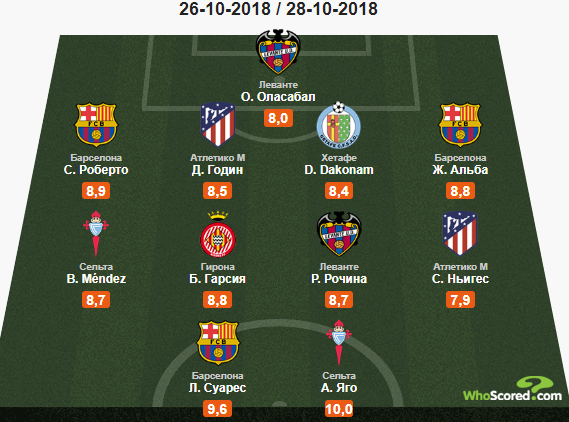 Центральный поединок 10-го тура Ла Лиги порадовал зрителей дебютным в сезоне Эль-классико. «Барселона» хотя и играла без Месси, не почувствовала никакого сопротивления со стороны «Реала». На переполненном «Камп Ноу» «каталонцы» наколотили в ворота соперника пять мячей, в то время как «сливочные» ответили всего одним. Главным кузнецом успеха стал Луис Суарес, на счету которого хет-трик. Этот матч стал последним для Хулена Лопетеги на посту главного тренера «сливочных», после игры его отправили в отставку. По итогам классико, «Барселона» остается на вершине турнирной таблицы, а «Реал» продолжает падение – уже 9 место.