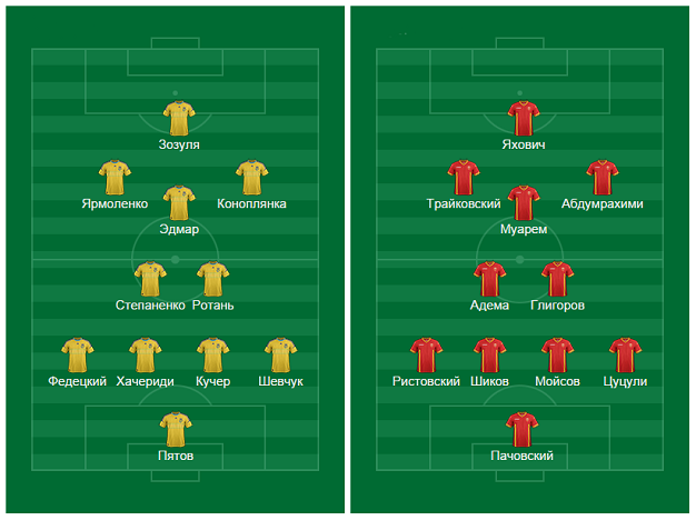 Сборная Украины подходит к матчу без пяти игроков: Рыбка, Безотосный, Макаренко, Гармаш и Селезнев получили травмы в предыдущих поединках и не смогут выйти на поле. В команде Македонии травмированных игроков трое – Ибраими, Демири и Хасани. Под вопросом находится участие в поединке Ристовского и Мойсова.