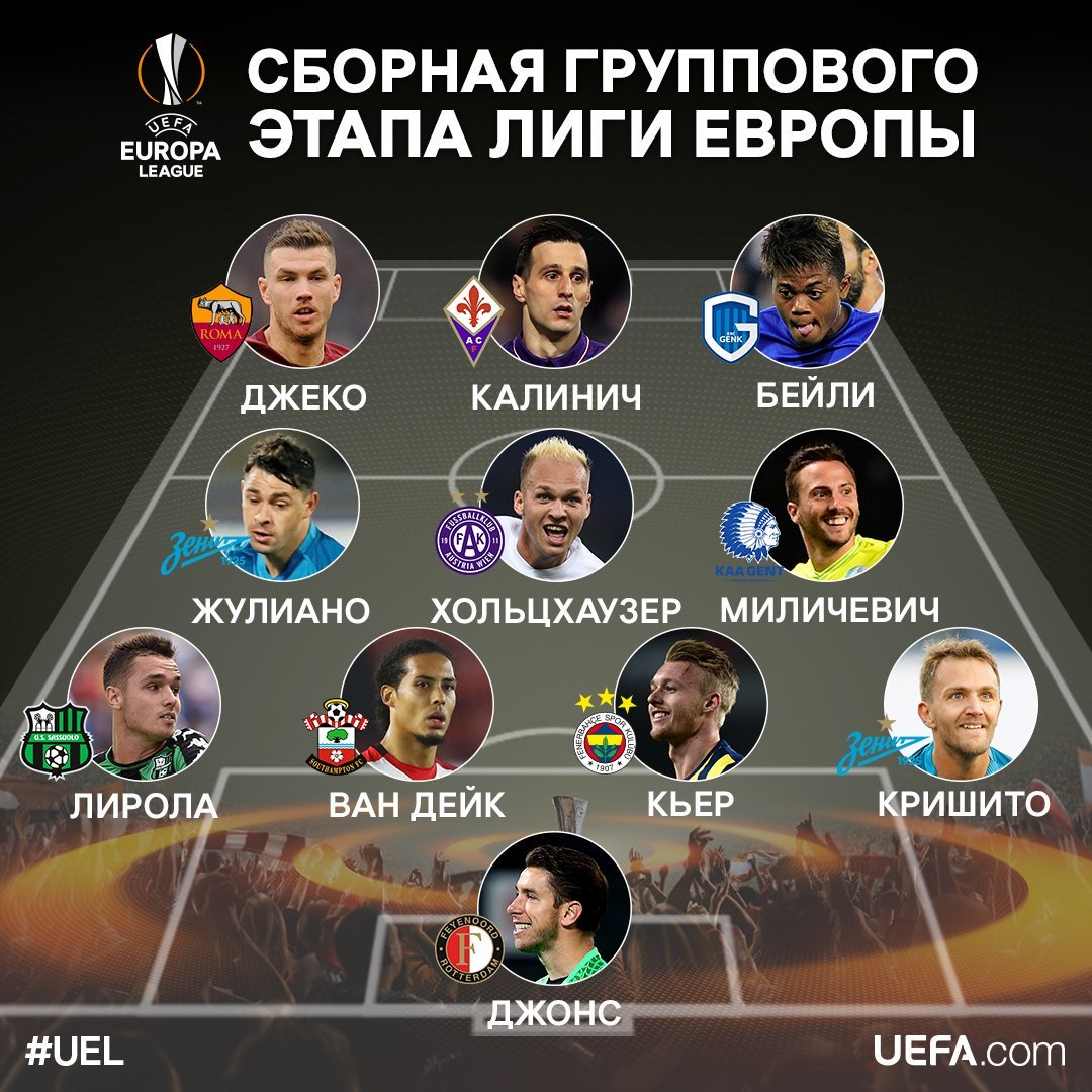 УЕФА опубликовал символическую сборную по итогам группового этапа Лиги Европы-2016/17.