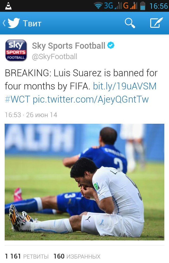 Форвард «Лирвепуля» и сборной Уругвая Луис Суарес дисквалифицирован на 9 матчей своей сборной за укус защитника сборной Италии Джорджо Кьеллини.