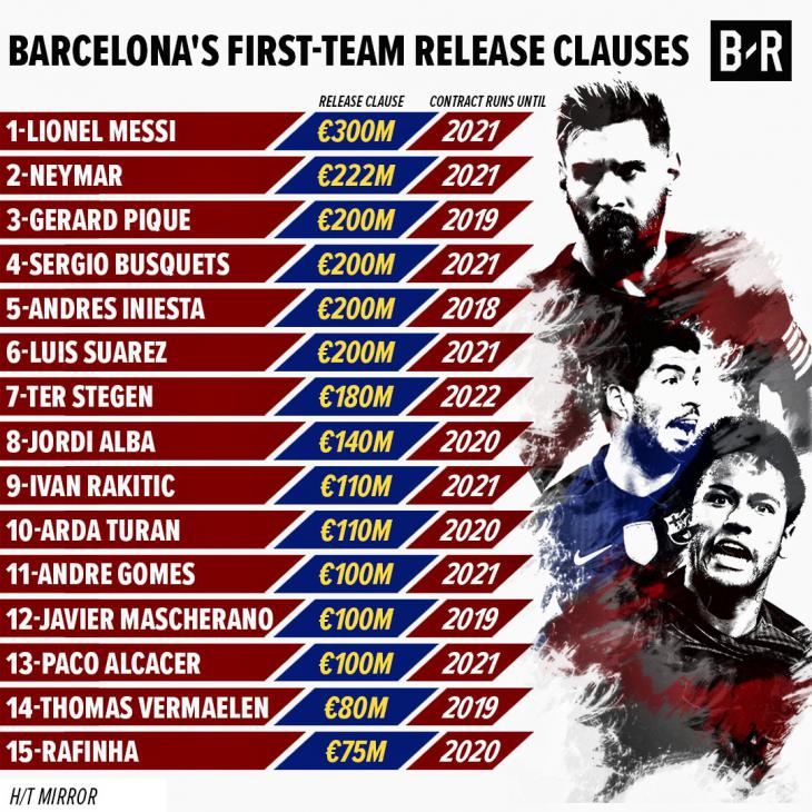 Согласно источнику, 13 игроков «сине-гранатовых» имеют в контракте опцию выкупа, что превышает 100 миллионов евро. Прогнозируемо самая большая клаусула прописана в контракте Лионеля Месси - 300 Mill. €. Следом расположился Неймар - 222 Mill. €. Третье место делят четыре исполнителя Пике, Бускетс, Иньеста, Суарес - 200 Mill. €. Наименьшую цену придется заплатить за Рафинью - 75 Mill. €. Что интересно, Томас Вермален, который фактически пропустил два сезона из-за различного рода травм, имеет опцию выкупа за 80 Mill. €.