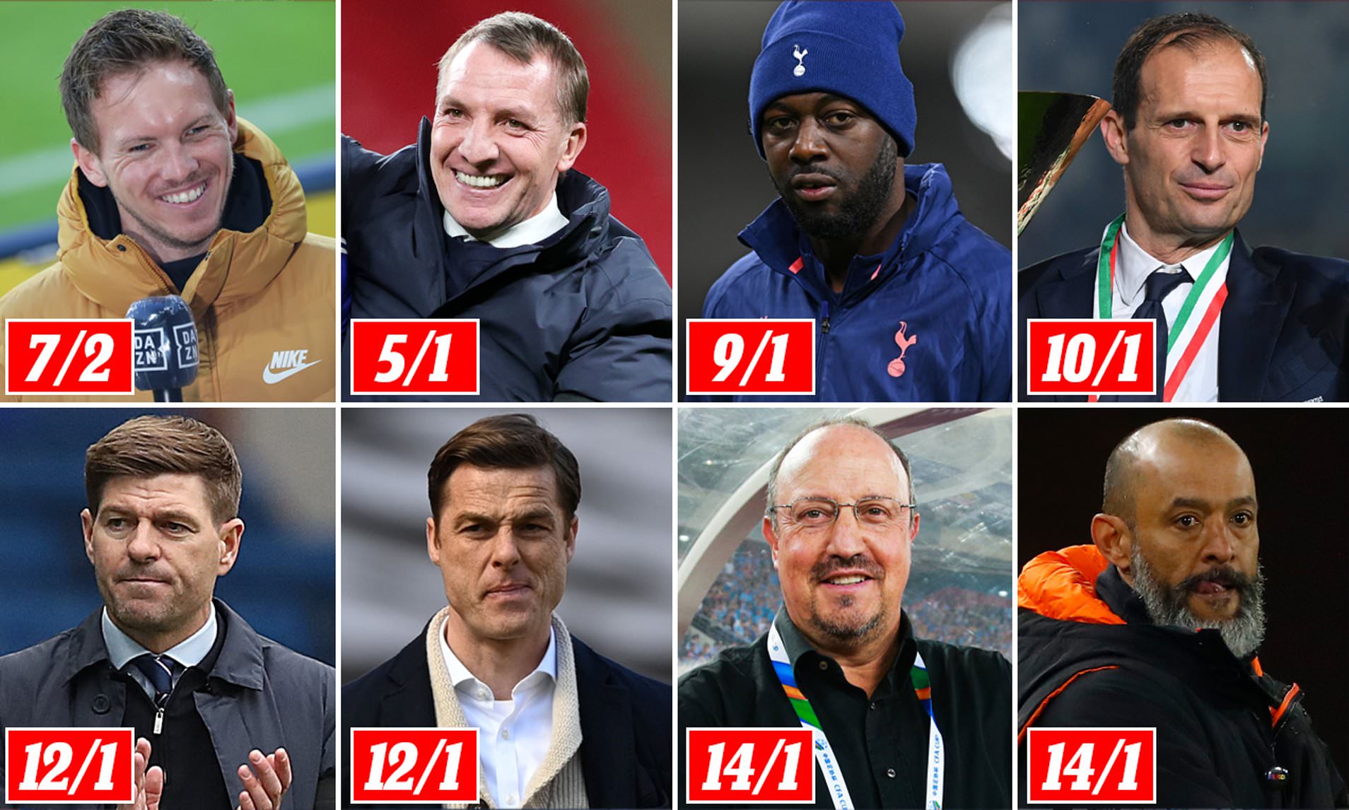 Среди других претендентов всплывают имена Макса Аллегри, Стивена Джеррарда, Скотта Паркера, Рафаэля Бенитеса, Нуну Эшпириту Санту и бывший капитан команды Ледли Кинг.